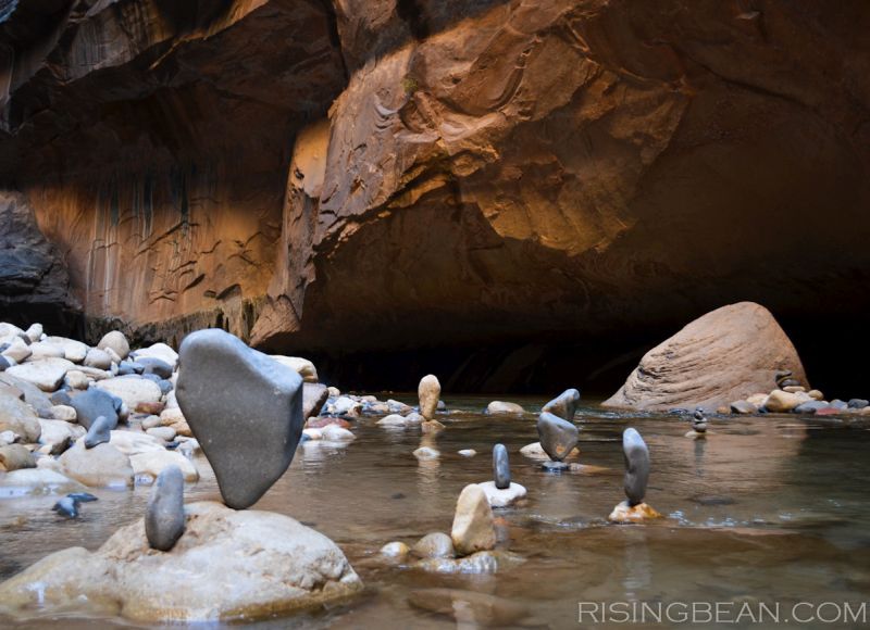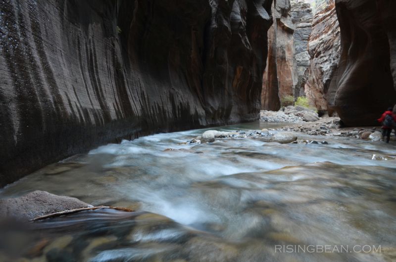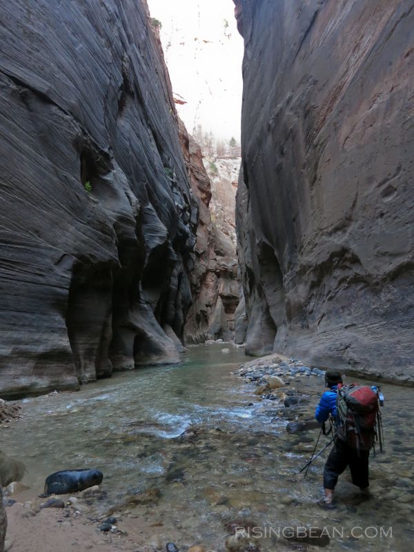 My partner did the hike reasonably comfortably in cheap water shoes from Walmart, and as mentioned, I wore hiking sandals. Don’t wear flip flops – they’ll keep falling off as you walk in the water, and there are sections where you’ll be walking in the water for a while. The best footwear can be hired from outfitters in the nearby town of Springdale. Alternatively, you can wear hiking shoes, but remember, they’ll get completely wet, shoes can take days to dry, and can potentially mold and stench if if they remain wet for too long.