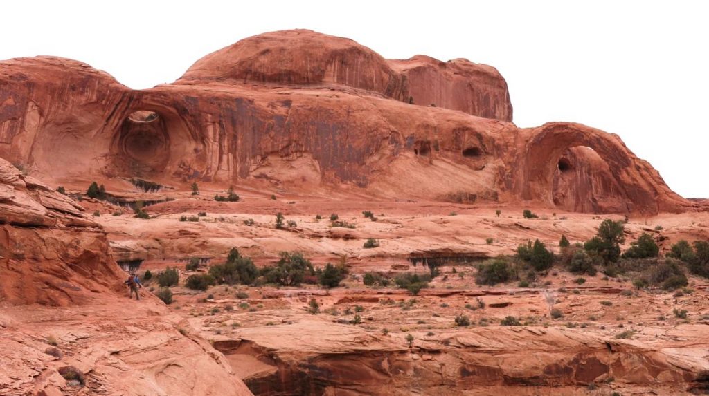 The Corona Arch can be reached via a fun and relatively flat hike over some really nice Moab landscape, and the Corona Arch area is even more interesting because Bowtie Arch is just next door to it and there are other several large cave formations.