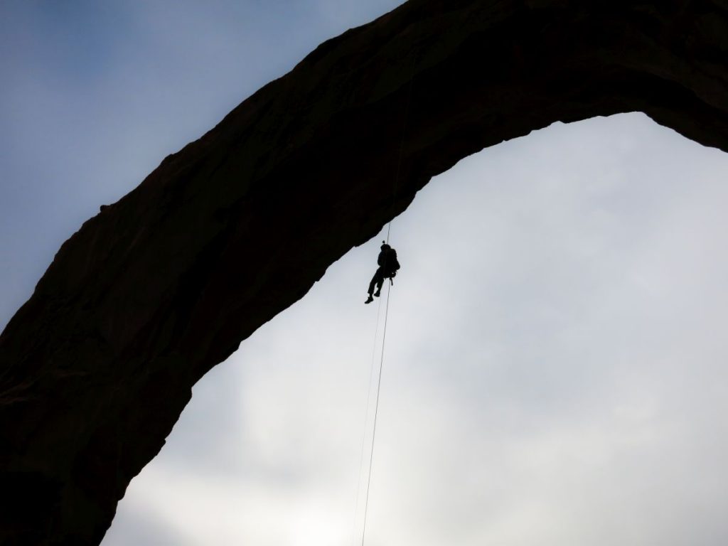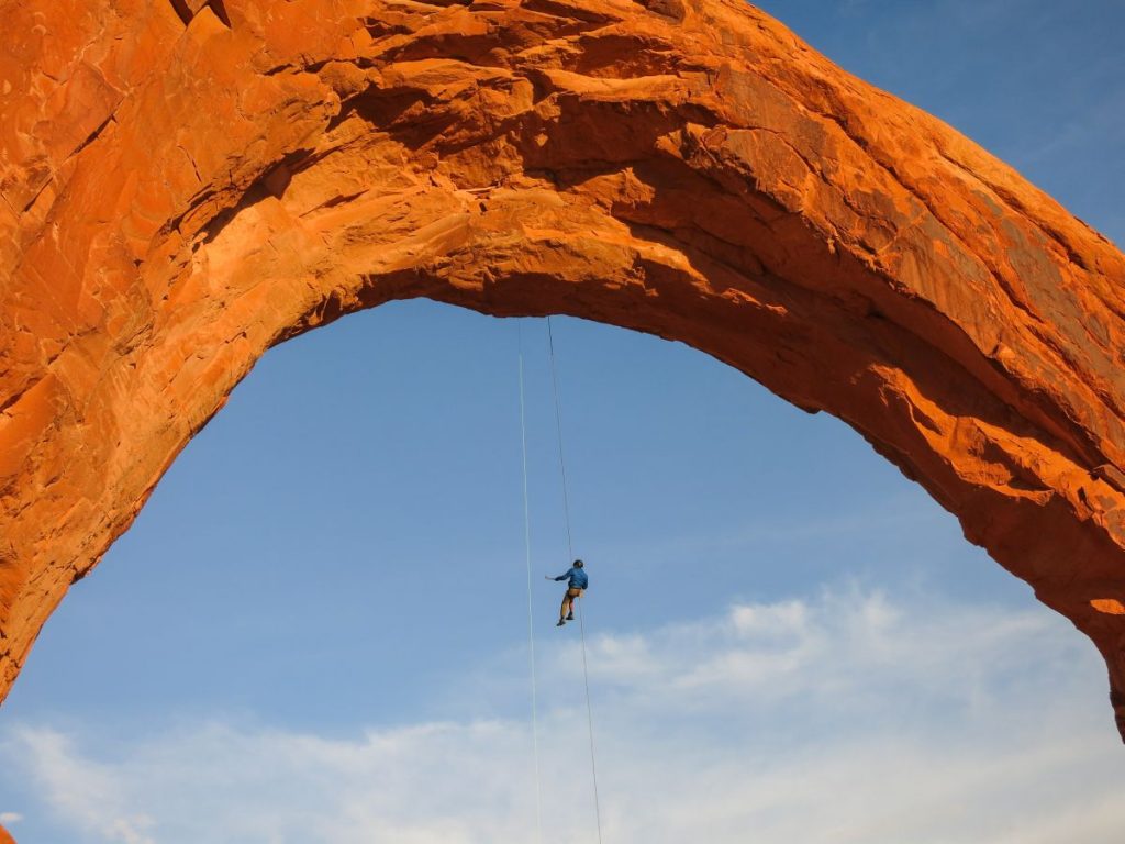 With no one around at the end of the day, I finish my final rappel with a mini rope-swing. The BIG rope swing is what eventually caused the temporary, and possibly permanent, closure of roped activites at the Arch. It was probably a tough call for the BLM as Moab is known as a place of unhinged adventure, but there are several other things to do if you make it out here.