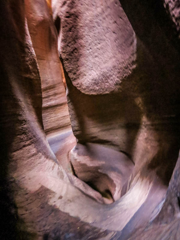 What happened was that the water level was low enough to form what’s called a keeper pothole – a pool that’s easy to get in but hard to get out of. Because the slot canyon is smoothed out by running water, the edge of the pool is also smooth and steep enough that my partner is stuck. The only way to get out is for me to go in and push her out and then have her pull me up.